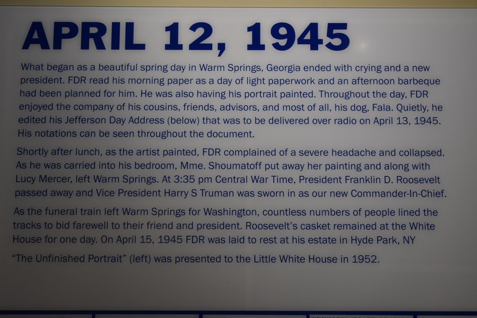 From the FDR residence, it was off to view some exhibits centered around Roosevelt’s last day, his death, and his legacy.